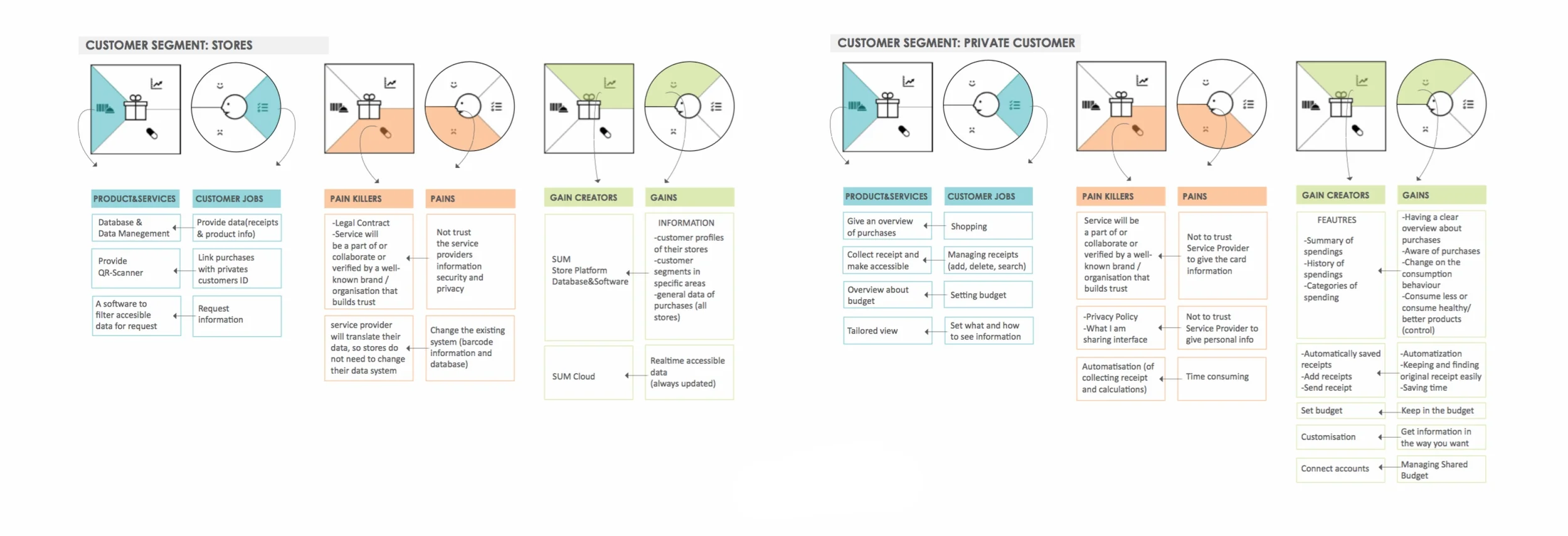 BENEFITS: There are already existing services which already provides gathered receipts information digitally. However, the private customer does not benefit as much by having only a receipt. SUM services distinguished by providing summaries of purchases and giving an overview of where money was spent on. That is why the private customers might prefer this platform instead of existing ones that only provides receipt data, but does not allow to compare spending between other weeks, months and years in different categories.Private customers can store all their receipts in SUM database and can access them anytime. Stores will benefit by having anonymised customer profiles. Knowing shopping habits of the specific groups would have a possible influence in this business.
