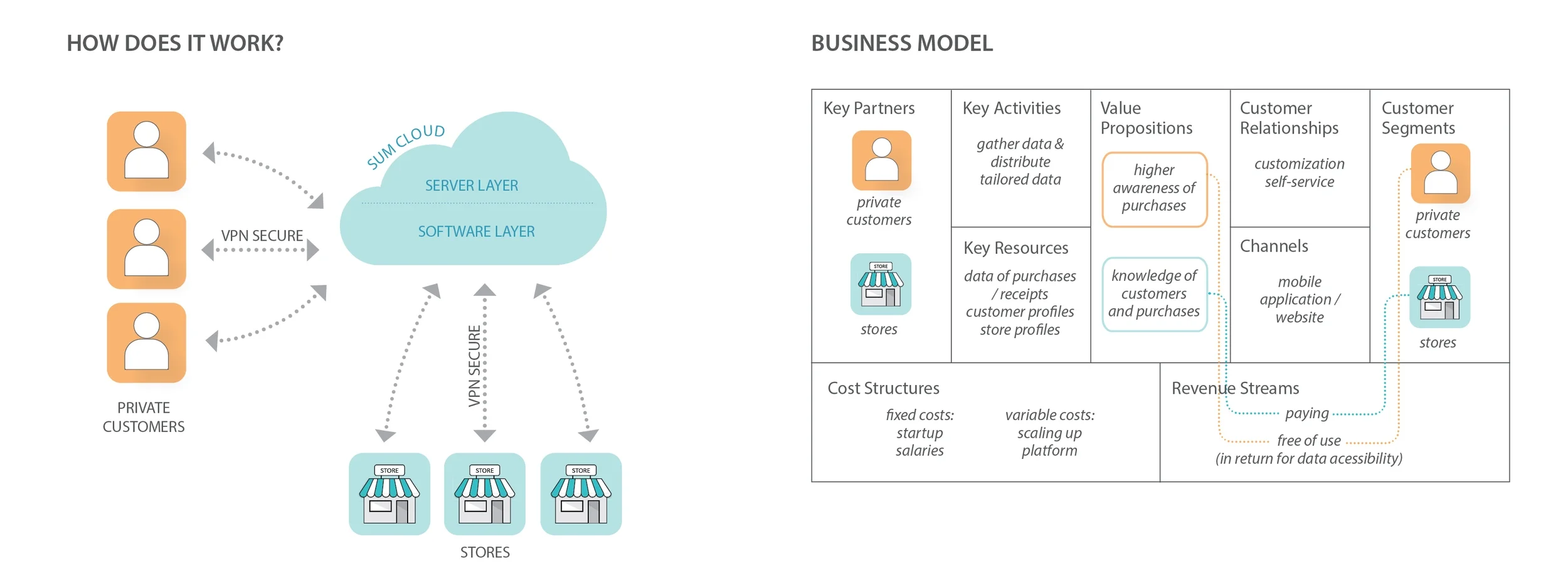 HOW DOES IT WORK? The service requires a private cloud that where all stores and private customers can access the send data through the internet connection. SUM will provide different software for private customers and stores. The service will be free for the customers that will enable a significant number of customers to join the service. Therefore, stores will be able to have knowledge of large customer segment and will be the paying customer segment.