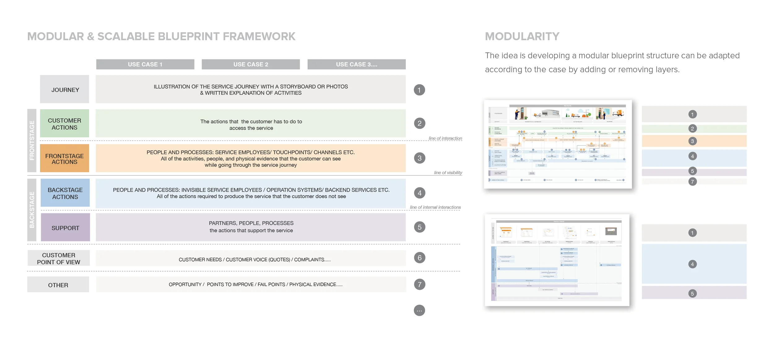 In the given case, there were more than thirty backstage services in the digital environment. To map out the alignment of these services with customer actions, the idea of scalability occurred. In order to have an easy to read map, we utilised modularity of the template and turned off the front-stage layers.